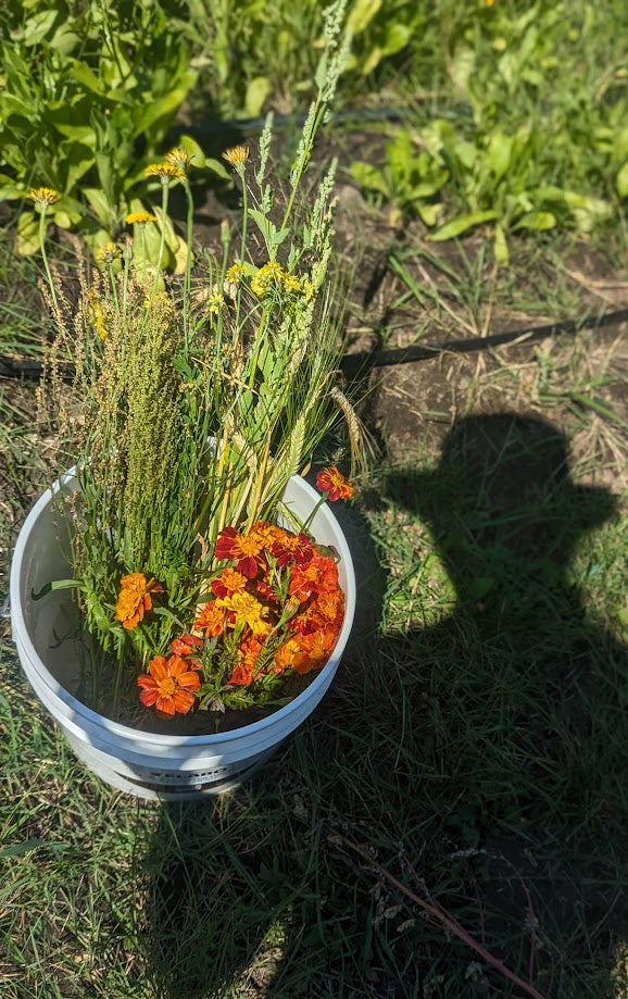 We are teaching ourselves firsthand how to work with nature by using regenerative principles in our land stewardship. We remember our pollinators and don't use herbicides. We keep our soil ecology in mind by paying attention to what we put in the dirt- focusing more on increasing the structure and biodiversity of the soil with organic matter, mycorrhizae, and natural supplements, instead of harsh fertilizers and heavy annual tillage.